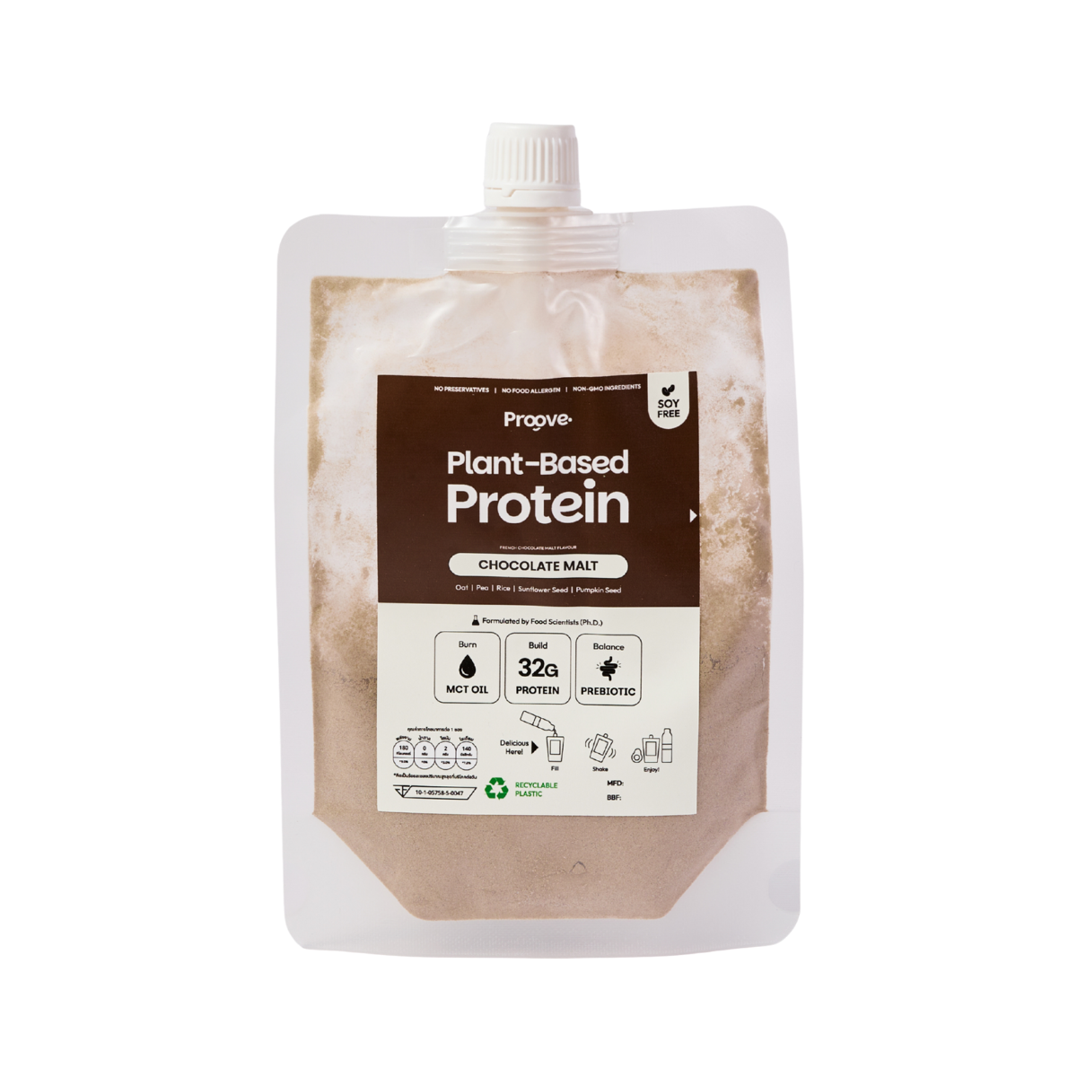 - โปรตีนจากพืชสูง 32 g/ซอง จากพืช 5 ชนิด (โอ๊ต, ถั่วลันเตา, เมล็ดทานตะวัน, เมล็ดฟักทอง, ข้าว)